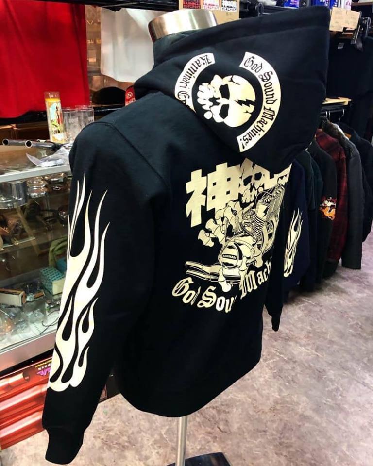 - 神鳴オリジナルGOD SOUND MACHINES!SKULLパーカー ブラック マッハ 神鳴エンヂニアリング マッハ トリプル 旧車 カワサキ 街道レーサー