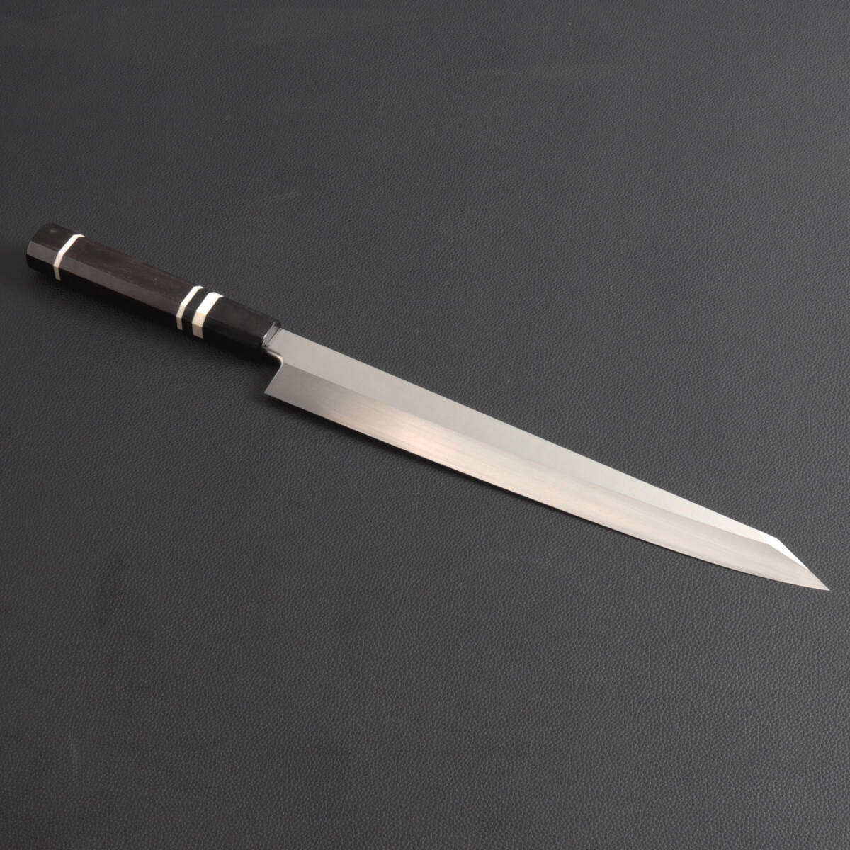 - 10068 勘所型切付包丁 尺一(刃渡り330mm) 刺身包丁 和包丁 料理包丁 刃は究極の切れ味 黒檀黒水牛角白三本巻八角柄