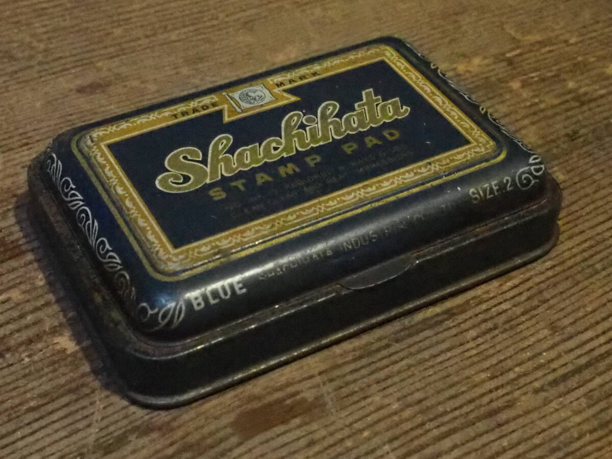 - 【昭和レトロなシャチハタスタンプパット青】判子朱肉アンティーク文具インテリア印鑑インク古道具インダストリアル骨董ブリキ缶事務用品