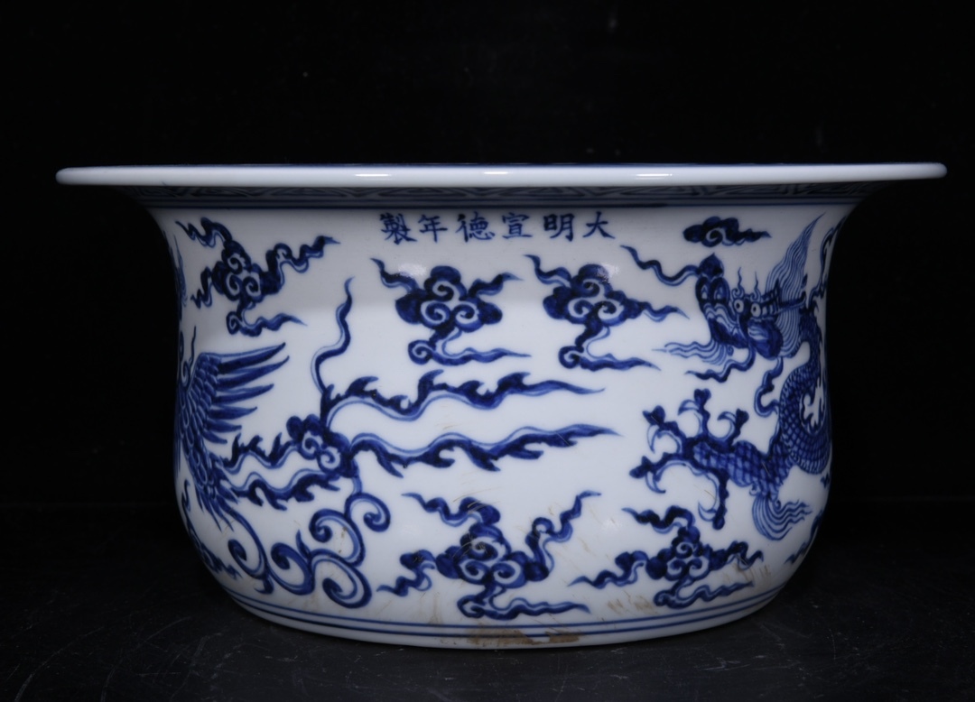 - ◆旧家蔵出◆古美術 中国古玩 大明宣徳年製款 青花 龍鳳紋大盆 鉢 古賞物 骨董 時代物 AT08