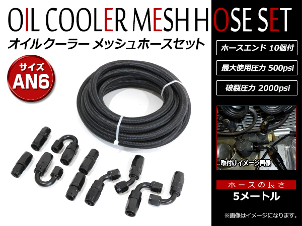 > AN6 オイルクーラー メッシュ ホース セット 5m ホースエンド 10個セット 黒 接手ホース 燃料パイプ フィッティング