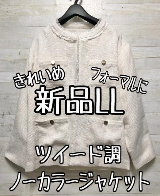 - 新品☆LLアイボリー系フリンジツイード調ノーカラージャケット〇p907