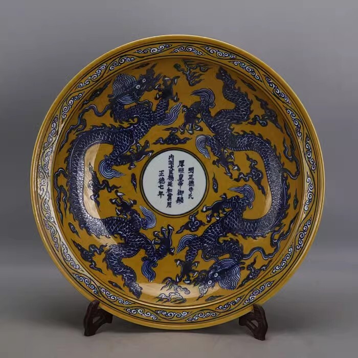- ◆旧家蔵出◆古美術 中国古玩 大明正徳年製款 青花 黄釉 双龍紋大盤 古賞物 骨董 時代物 CN01