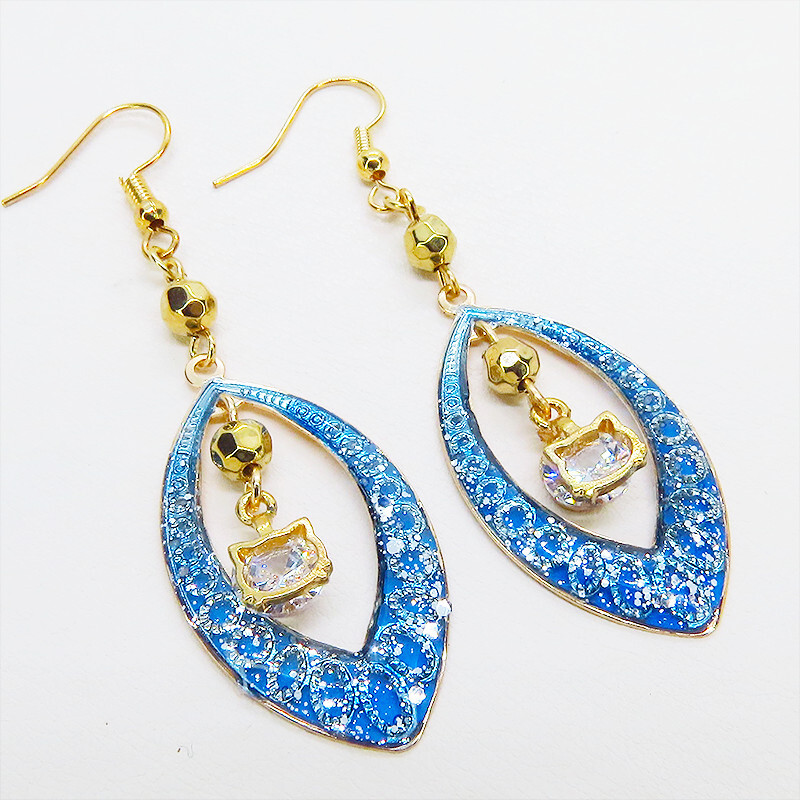 - マットゴールド 猫フェイスフレームラインストーン ティアドロップ ブルーレジンピアス サージカル可