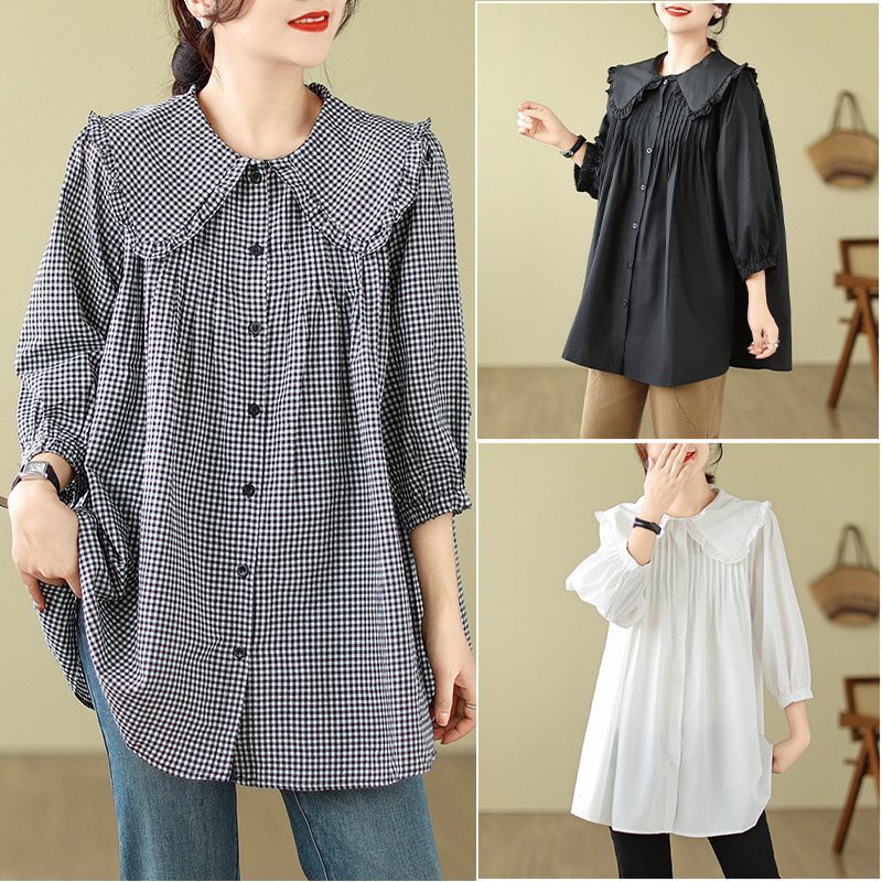 > OHJ924★お色選択可 チェック柄 シャツ ブラウス チュニック トップス ロングシャツ 長袖 春秋 aライン 大きいサイズ お洒落カジュアル風