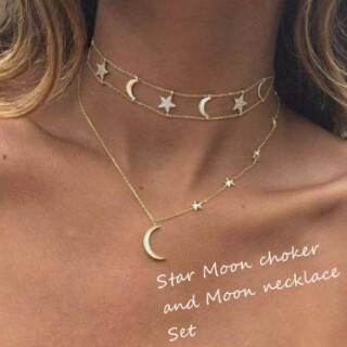 - 063 ゴールド カラー レディース アクセサリー セット ネックレス チョーカー ダブル チェーン 月 星 お洒落