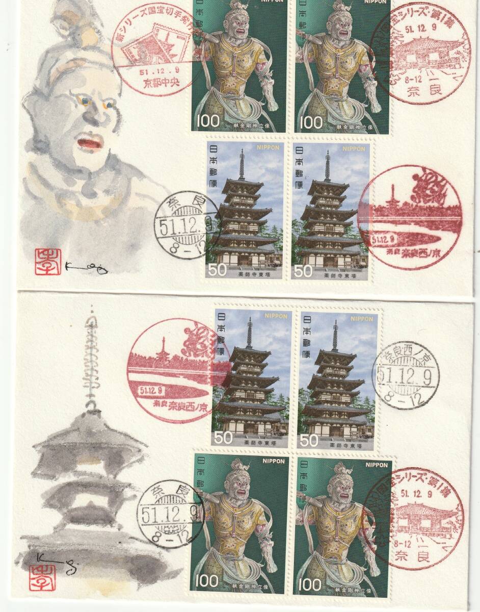- FDC 1976年 国宝シリーズ 第1集 50円100円 3通 肉筆藤井孝次郎
