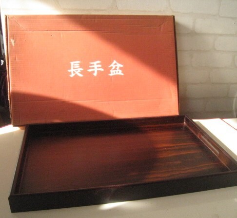 - 木製 長手盆 お盆 長方形 持ち手付き 輪シミあり サイズ:約30.5×48.5×H4㎝/24N11.7-20