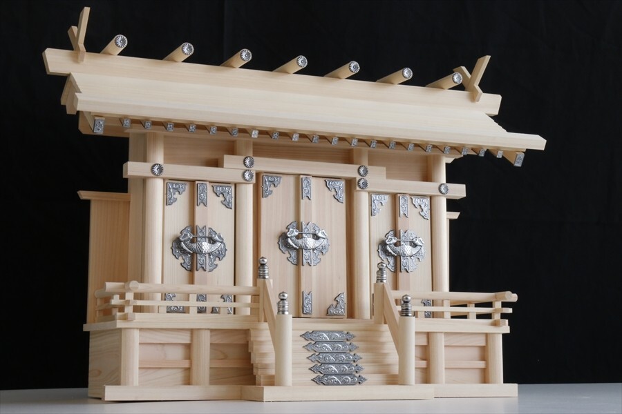 - 通し屋根三社 ■ いぶし銀の装飾 ■ 美しい東濃桧 神棚 (お社本体)高さ44cm×幅60cm×奥行き24cm