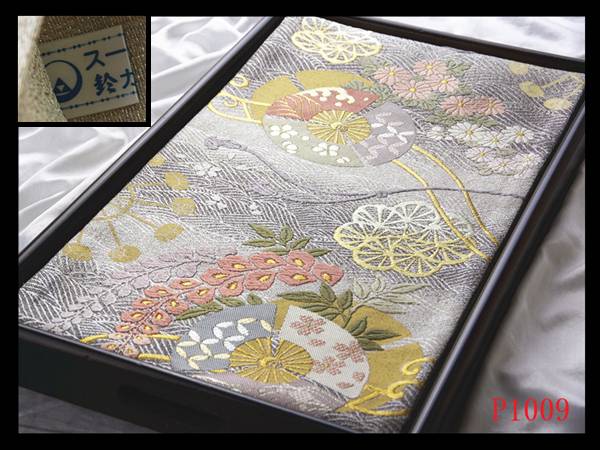 - P1009西陣逸品 唐織 振袖可 流水草花紋 シルバー色地 ふっくら豊かに 正絹純金糸六通高級美術袋帯 ◇検◇簪着物名古屋帯帯締め