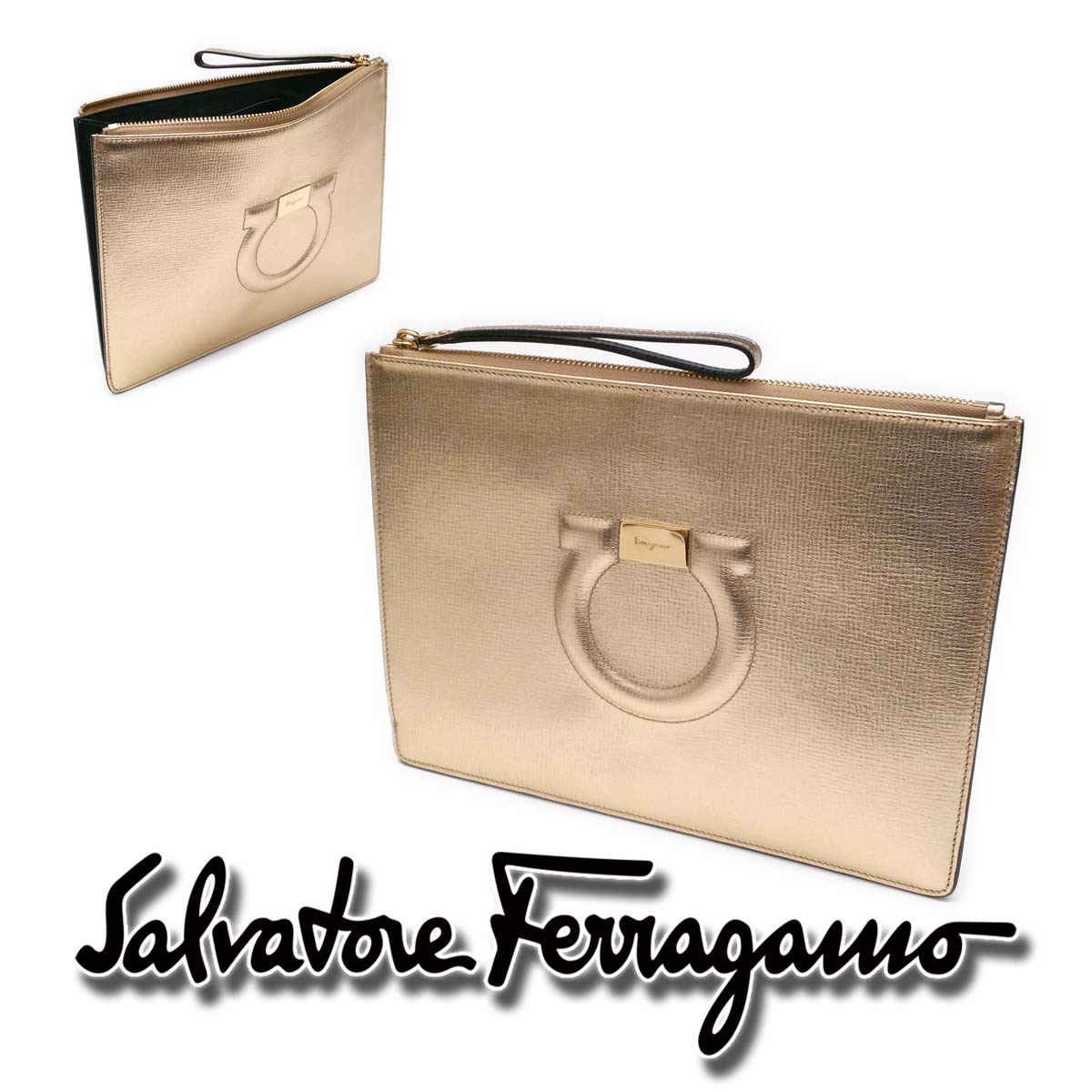 > 【未使用-新品同様】フェラガモ ガンチーニ クラッチバッグ ゴールドレザー G金具 メンズ レディース 箱 ap9425【一撃即決】