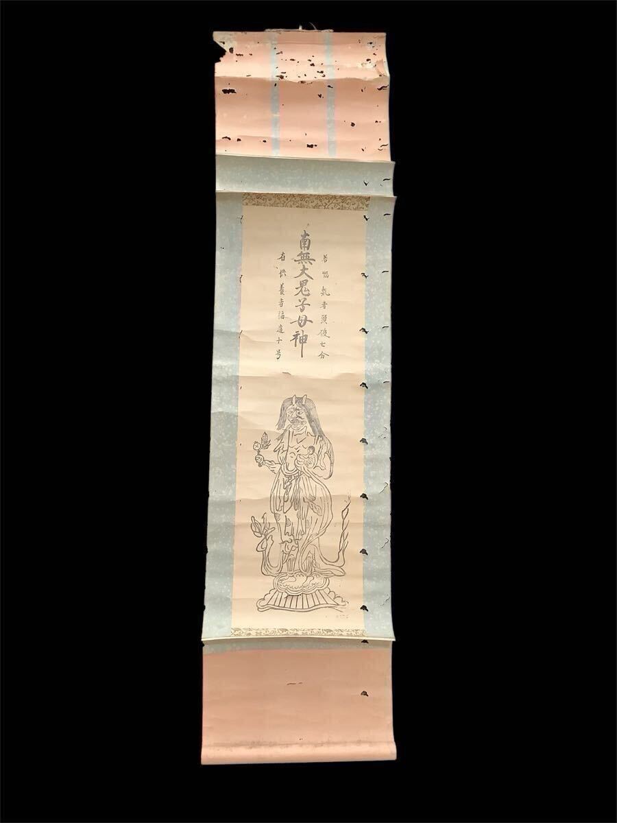 - 掛軸De686[鬼子母神図]紙本版摺 木版画/送料600円 仏画 仏教美術 南無鬼子母神 画賛 守護神 天部