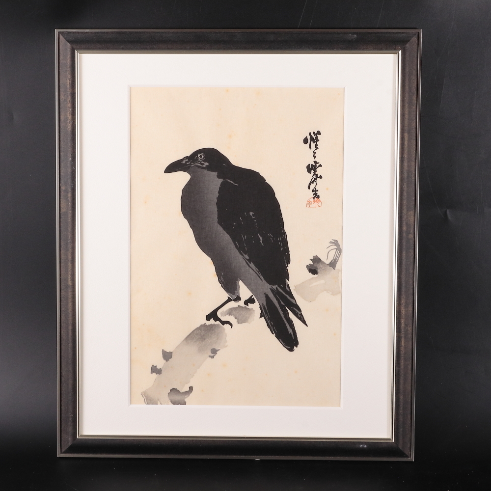 - ◆◇【模写】河鍋暁斎 「枯木寒鴉図 手刷木版画 額装 河鍋暁斎記念美術館◇◆