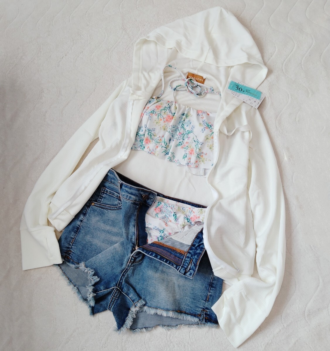 > 未使用タグ付き*PEAK&PINE*セットアップ*水着*バンドゥビキニ*デニムパンツ*ラッシュガード*9M*花柄*白*ピークアンドパイン*新品