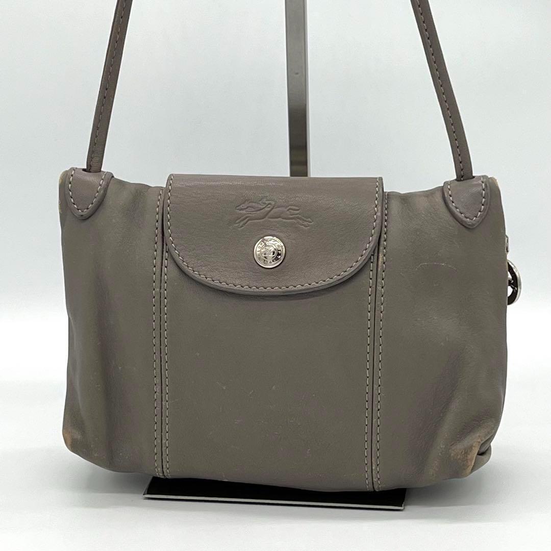 > 【良品】LONGCHAMP ロンシャン キュイール ポシェット ショルダーバッグ クロスボディ ミニバッグ 斜めがけ レディース グレー BJ000804