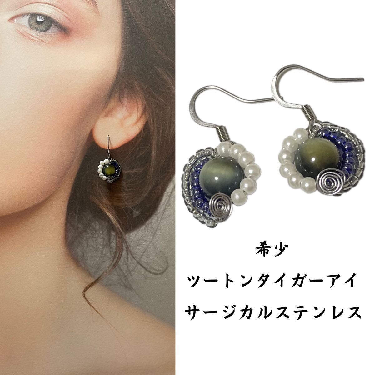 > TT27. 天然石 ピアス 希少 レアストーン ツートン タイガーアイ アレルギーフリー ニッケルフリー サージカルステンレス ハンドメイド