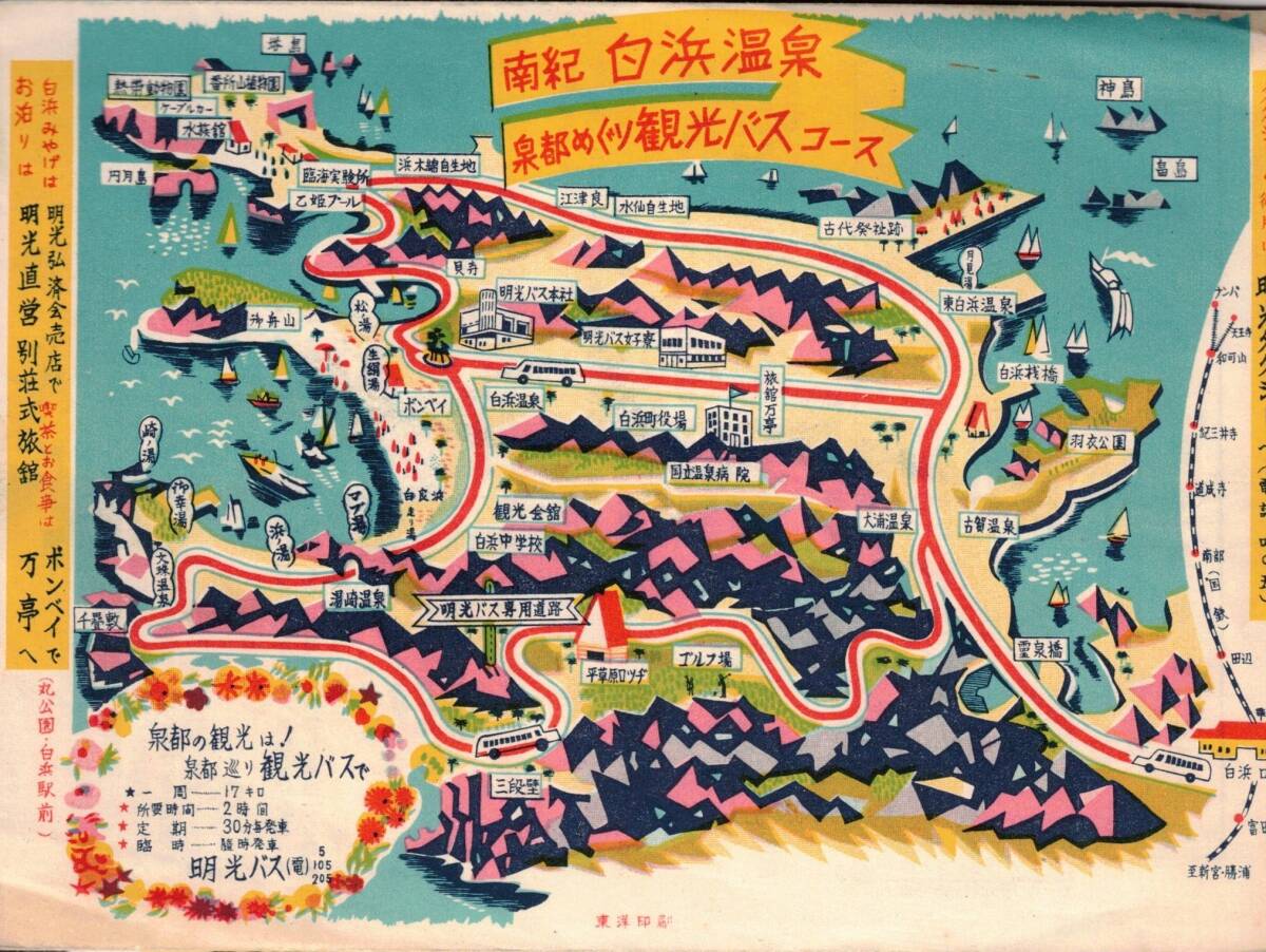 > 南紀白浜温泉泉都めぐり観光バスコース 明光バス 白浜大阪間直通列車時刻表・白浜エレジー新串本節等郷土民謡和歌山県推薦銘菓はったつ等