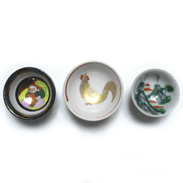 - 九谷焼★政志等 盃 鳥文様 青粒・七福神文様 山水文様 3種
