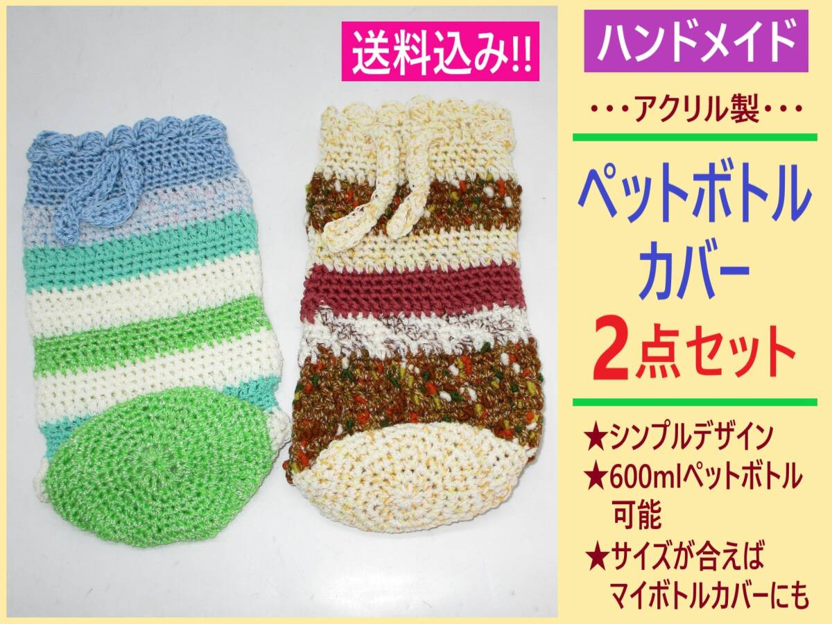 > ハンドメイド ペットボトル カバー 2点 D 手編み シンプル アクリル 目印 大きめ 600ml可能 ボトル ホルダー マイボトル 水筒 袋 ボーダー