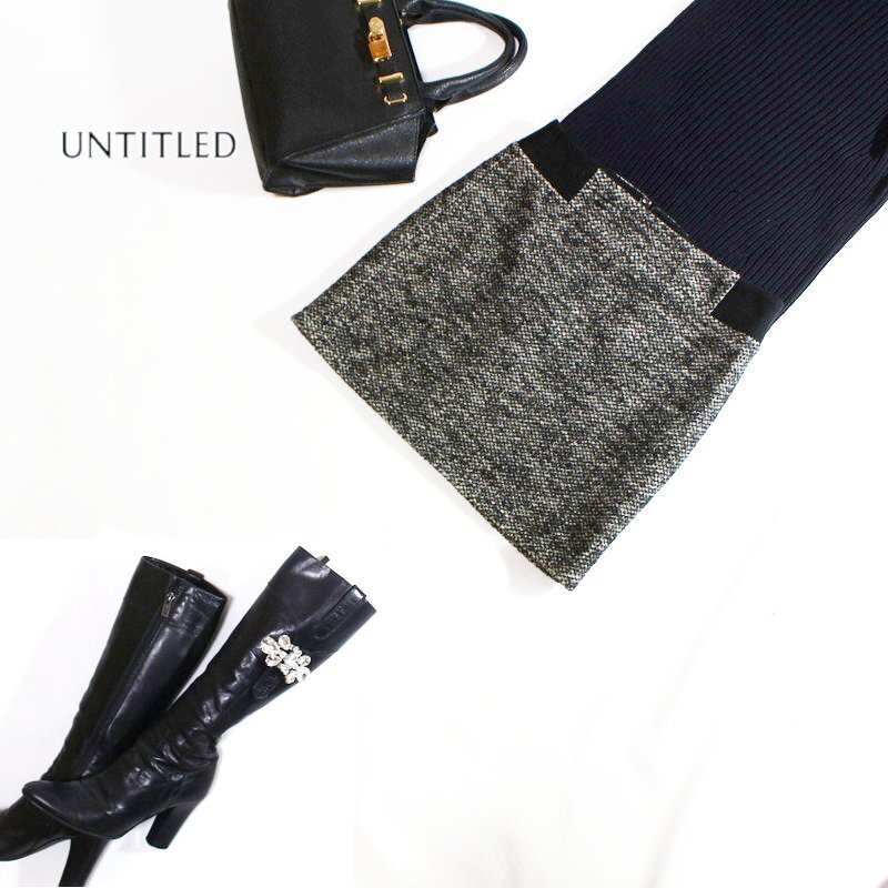 > 美品 厚手 アンタイトル UNTITLED 株) ワールド 冬 無地切替 ミックスウール ツイードスカート 0 5号 ブラック 黒 ホワイト ウールスカート