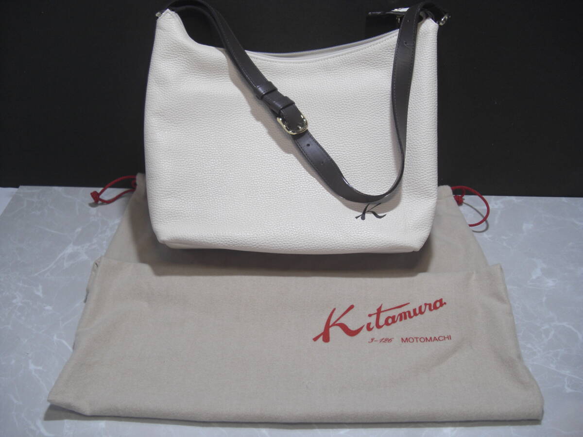 > ♪(美品)Kitamura キタムラ フォーマル ハンドバッグ ワンショルダー 2WAY レザー 本革 ロゴ型抜 ライトベージュ系