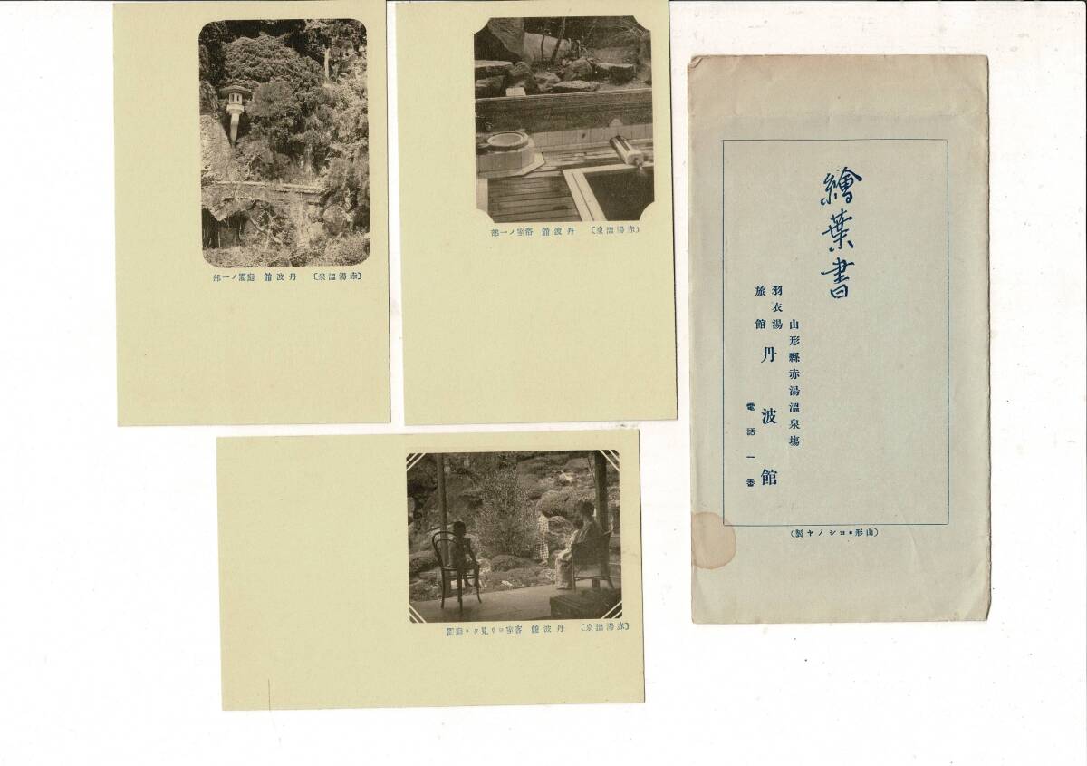 - *山形県赤湯温泉場 羽衣湯旅館 丹波館 山形ヨシノヤ製 レトロ絵葉書3枚とタトウ タトウに汚れ 庭園/庭園一部/浴室一部 RPM03125MU12