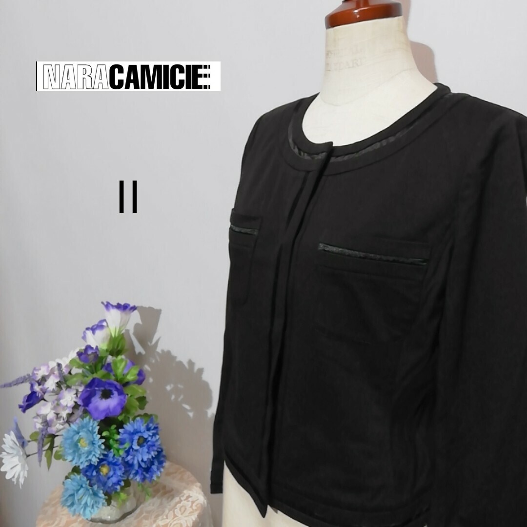 - 極上美品 ナラカミーチェ 若干伸縮性有 ノーカラージャケット 黒色系 Lサイズ