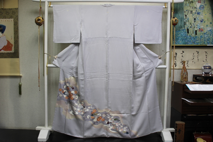 - きもの今昔8101 色留袖訪問着 広衿袷手縫い仕立 高級正絹紋意匠籠目地紋 七宝青海波道長取りに友禅 身丈162cm