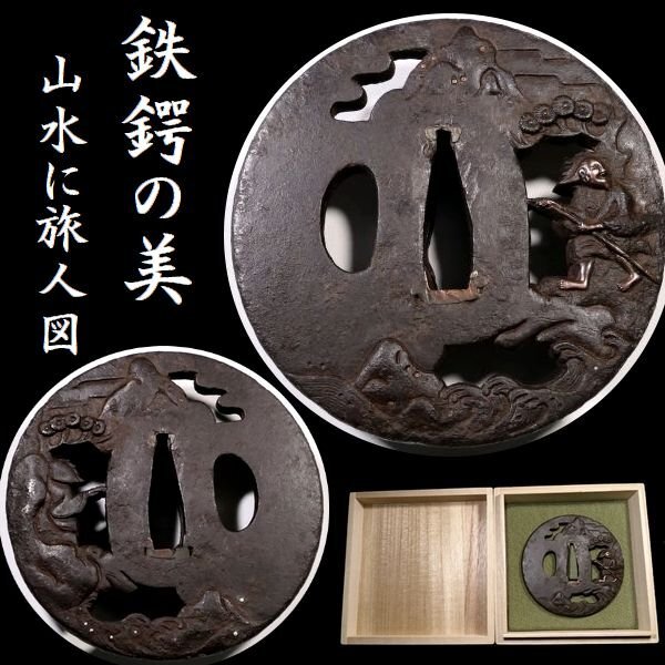 > 【 恵 #1501 】 鉄鍔の美 山水に旅人の図 厚み5mm以上 重厚な鉄地鍔 検:鍔/縁頭/切羽/ハバキ/刀剣/刀装具