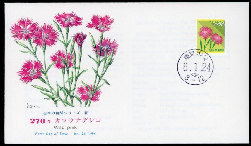 - 0186 【FDC】平成切手 270円「カワラナデシコ」日本の自然:花[東京中央/6.1.24/NCC]