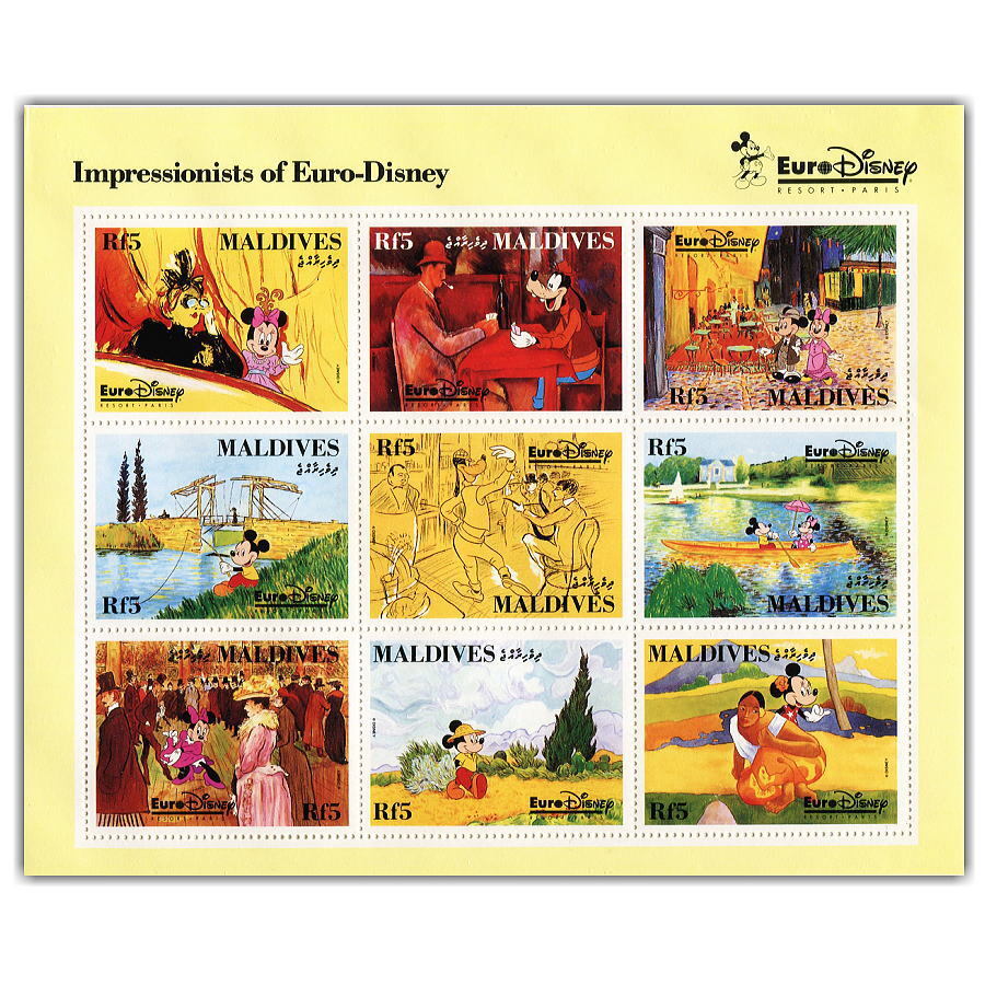 - ディズニー ミッキー&ミニー&グーフィー 切手9枚1シート(ユーロ・ディズニー) 発行国Maldives 1980年発行 未使用