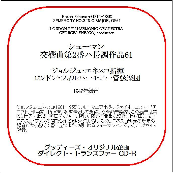 - シューマン:交響曲第2番/ジョルジュ・エネスコ/送料無料/ダイレクト・トランスファーCD-R