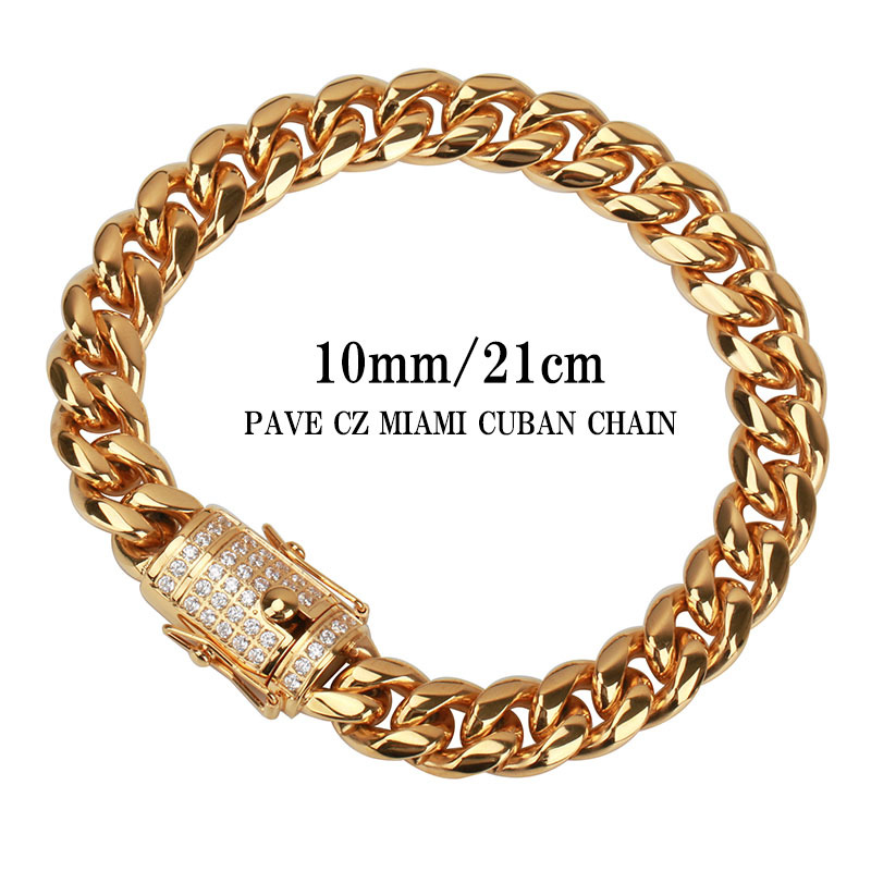 - STAINLESS 幅10mm ゴールド 喜平チェーンブレスレット ブリンブリン 差し込み式 二重ロック 21cm パヴェ CZ
