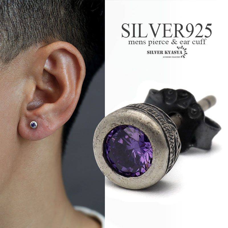 - アメジストピアス シルバー925 メンズ スタッドピアス シルバー 一粒ピアス 燻 アンティーク 金属アレルギー対応 片耳 1点