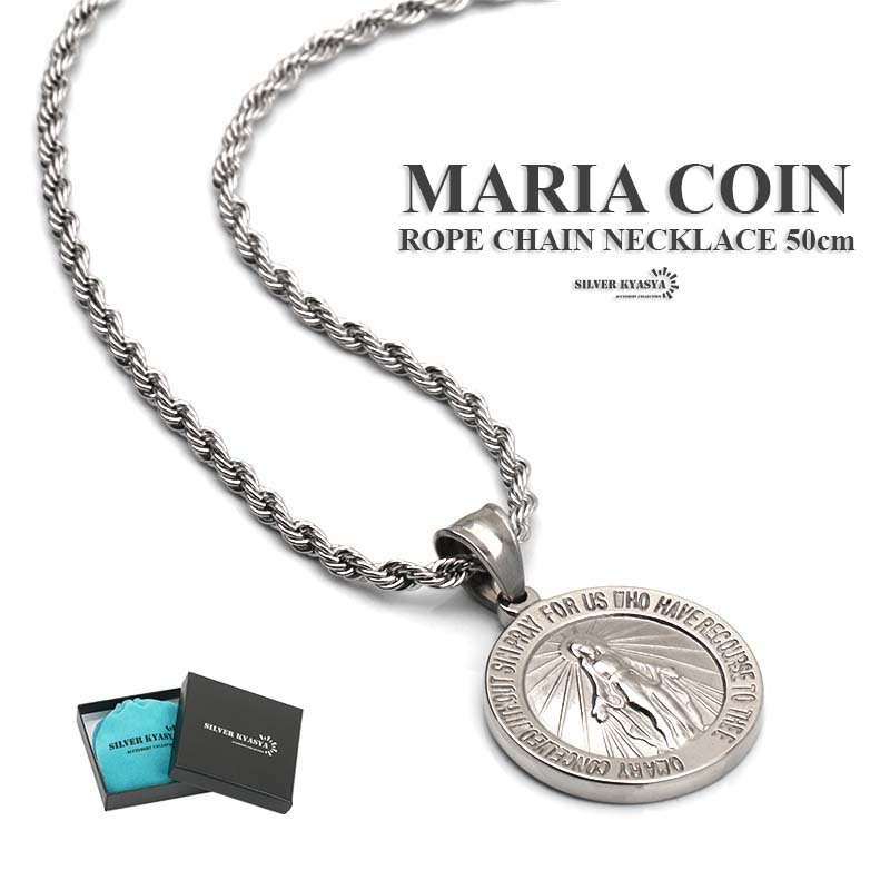 - 奇跡のメダイ ネックレス シルバー 色 聖母 コインネックレス ロープチェーン 50cm 専用BOX付属