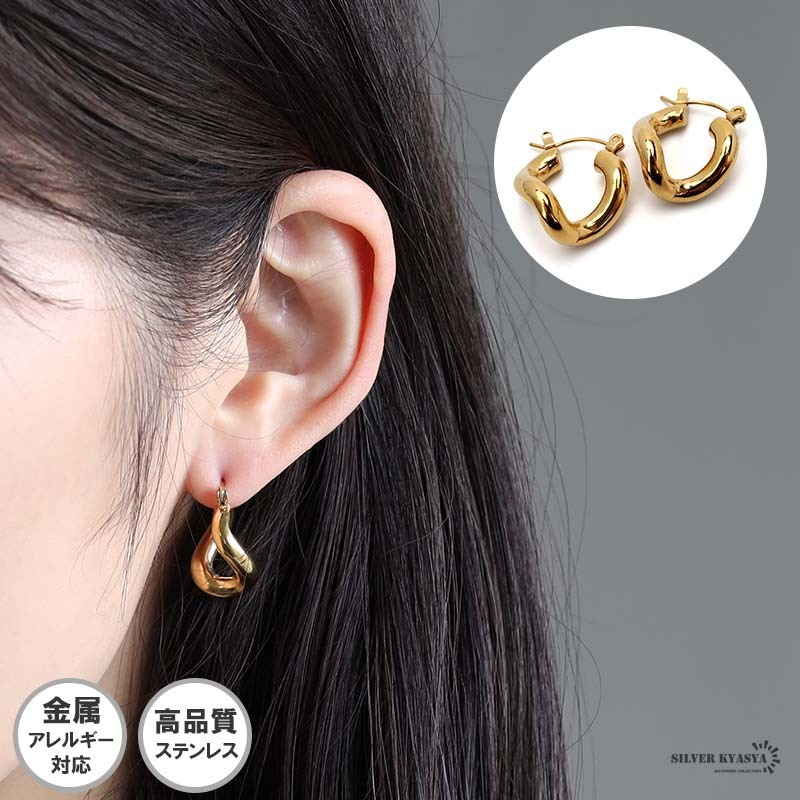 - ステンレス ねじれピアス ワイドピアス 大ぶりピアス 両耳2点セット ゴールド フープピアス 金属アレルギー対応
