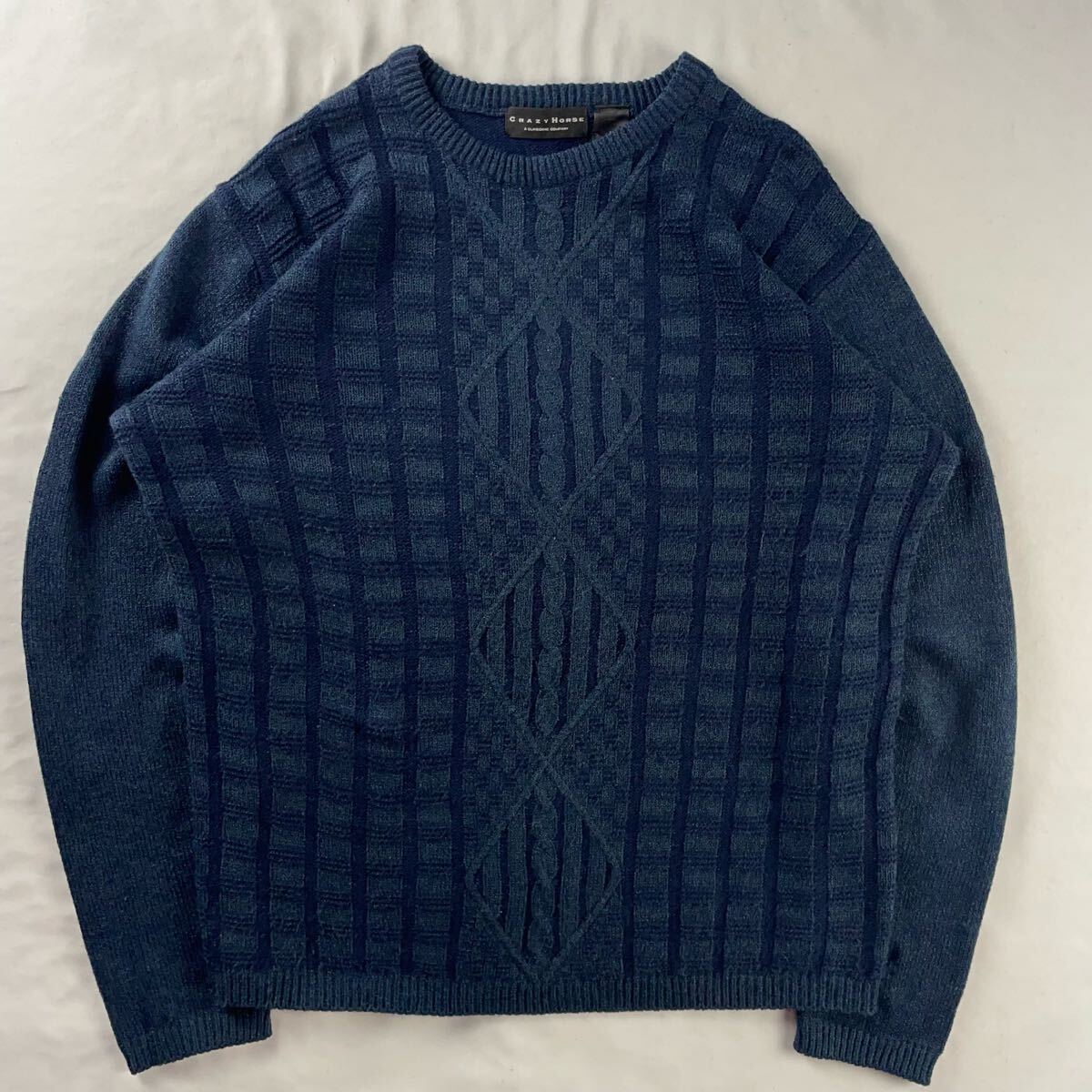 > US Vintage 00s CRAZY HORSE アクリル ナイロン 立体 3D ブロック ケーブル編み 格子柄 単色 プレーン ネイビー メランジ デザインニット