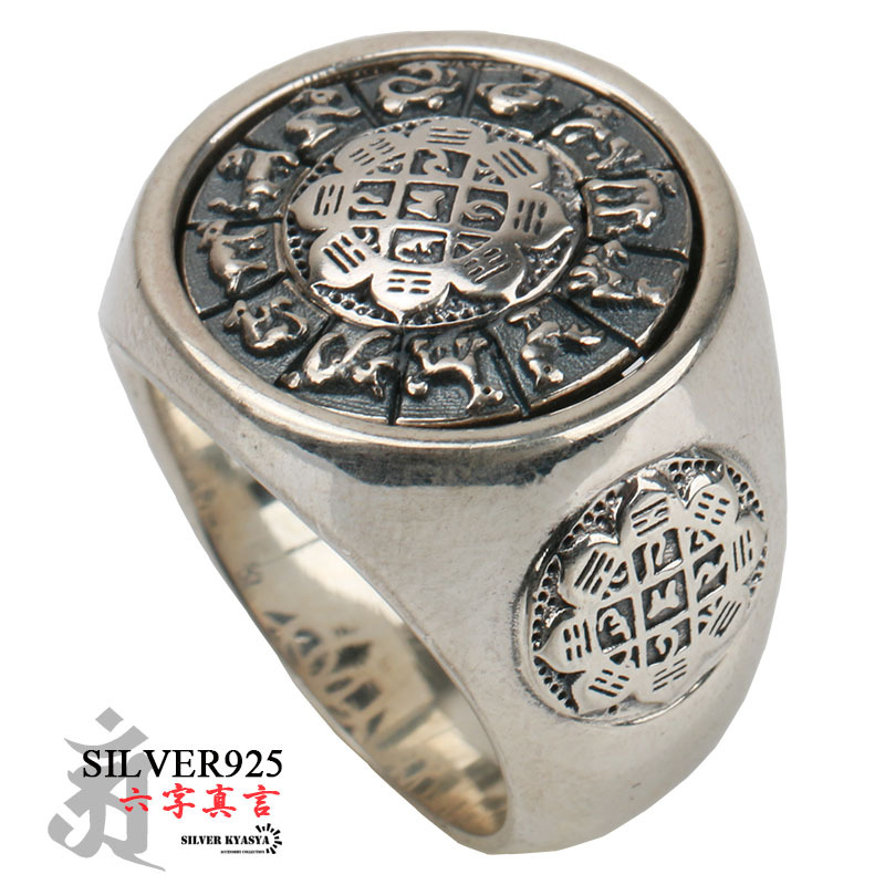 > (26号) シルバー925 六字真言 リング 指輪 干支 十二支 動物 宗教 ギミック 動くアクセサリー 印台リング 銀 刻印