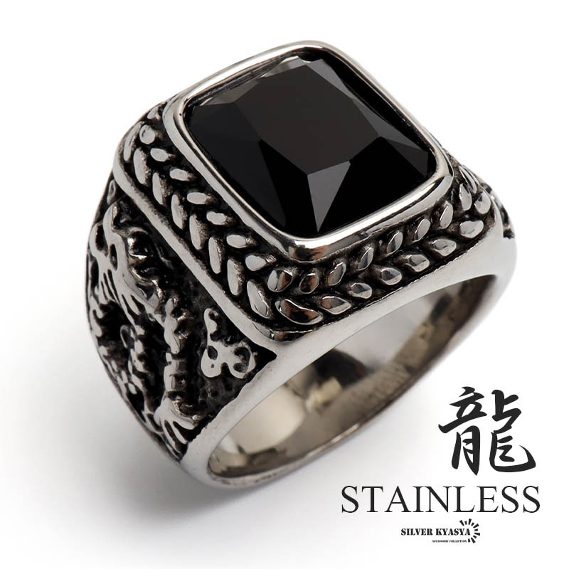 - (29号) ステンレス カレッジリング ドラゴンリング オニキスリング シルバー ドラゴン 印台リング メンズ 金属アレルギー対応