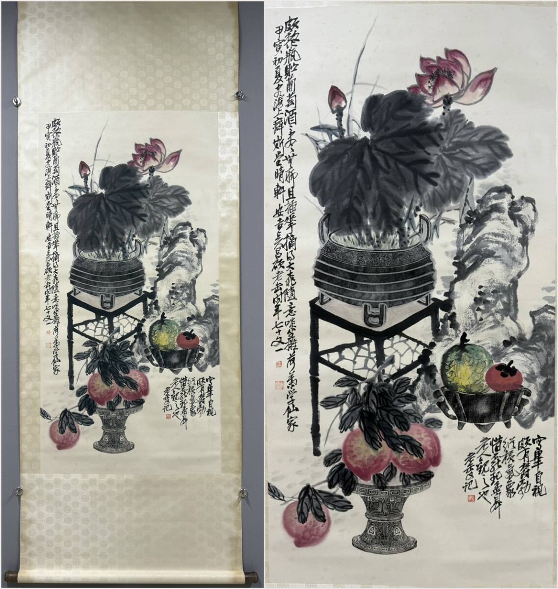 - 古美術 掛け軸 中国・近現代 「呉昌碩書」 紙本 【延年益寿図】 立軸 書道 巻き物 肉筆保証 唐物 古画 LT-250226
