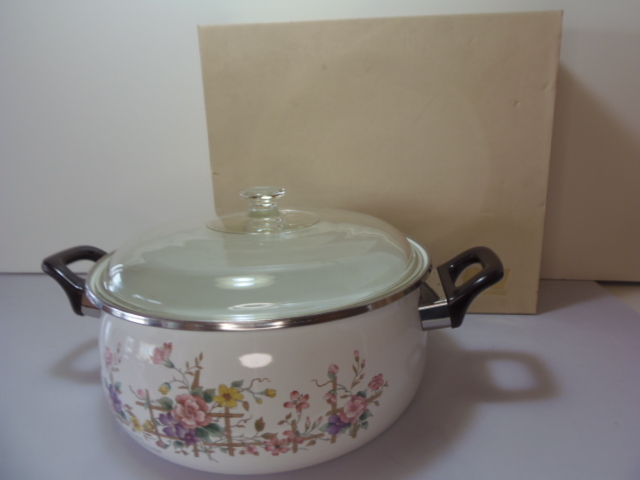 - t1 【両手鍋 27センチ】 HOROWARE 琺瑯 花柄 硝子蓋【同梱不可】