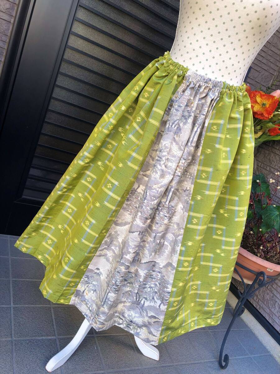 - 即決 ハンドメイド 着物リメイク・和服リメイク 紬 黄緑・白 フレアスカート・ロングスカート 正絹 送料230円 アンティーク