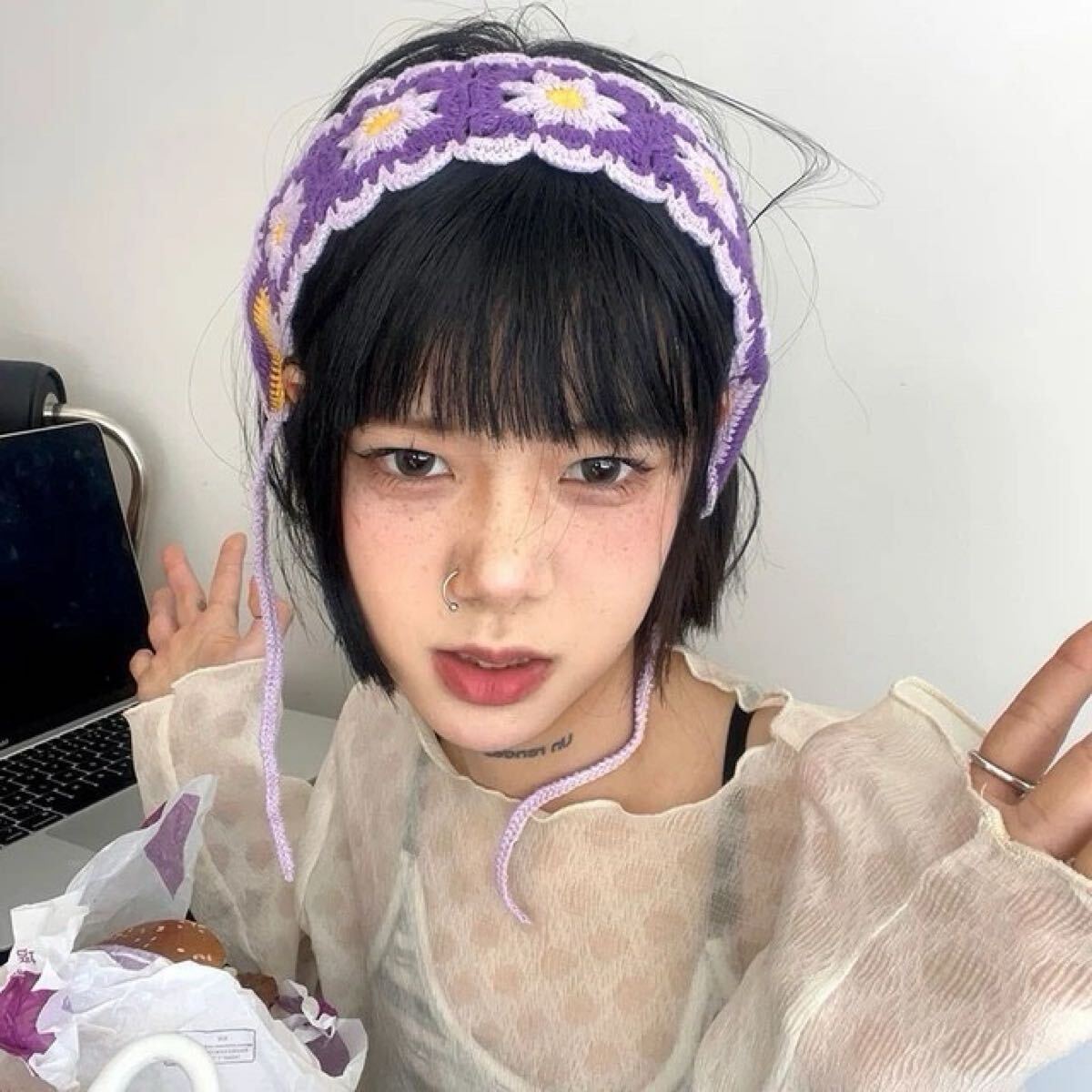 - かぎ針編み バブーシュカ パープル 韓国 ヘアバンド クロシェ 花柄