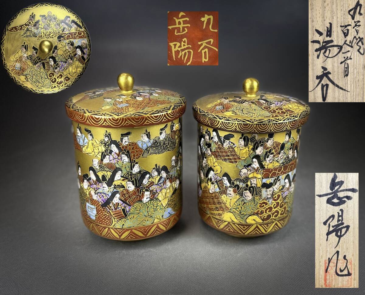> 【偲】九谷焼 岳陽 金彩蓋付湯呑 細字名人 百人一首細字筆 一対 ペア 夫婦湯呑 百人首湯呑 茶道具 栞 共箱 共布 在銘 c-42.