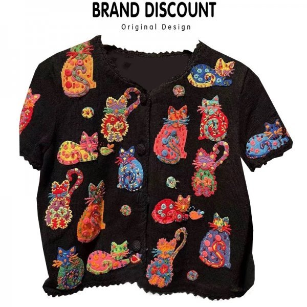 - yh セール セーター ニット 可愛い猫の刺 チュニック ゆったり 半袖 ブラック