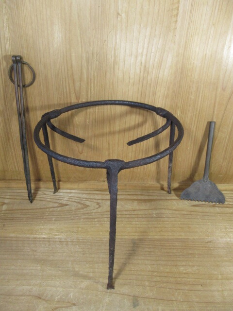 - ◆時代囲炉裏道具3点:10:◆大型◆三足鉄製五徳◆真鍮灰掻◆真鍮太丸火箸:繋ぎ鉄丸菅◆鍛冶屋頑丈造◆