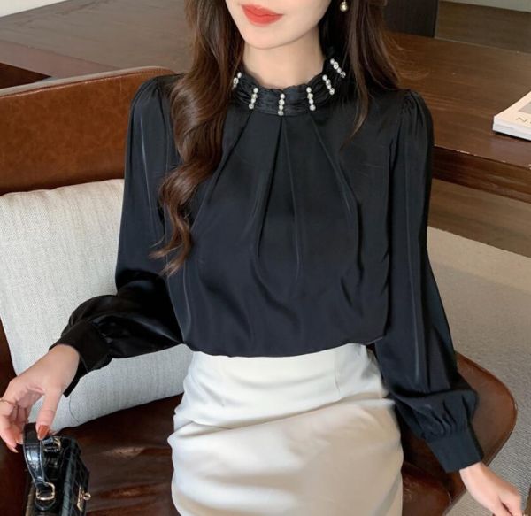 - 人気推薦/サテン シャツ ブラウス オフィス ビジネス フォーマル 卒業式 卒園式 入学式 入園式 着痩せ 通勤 細身 長袖 トップス/黒