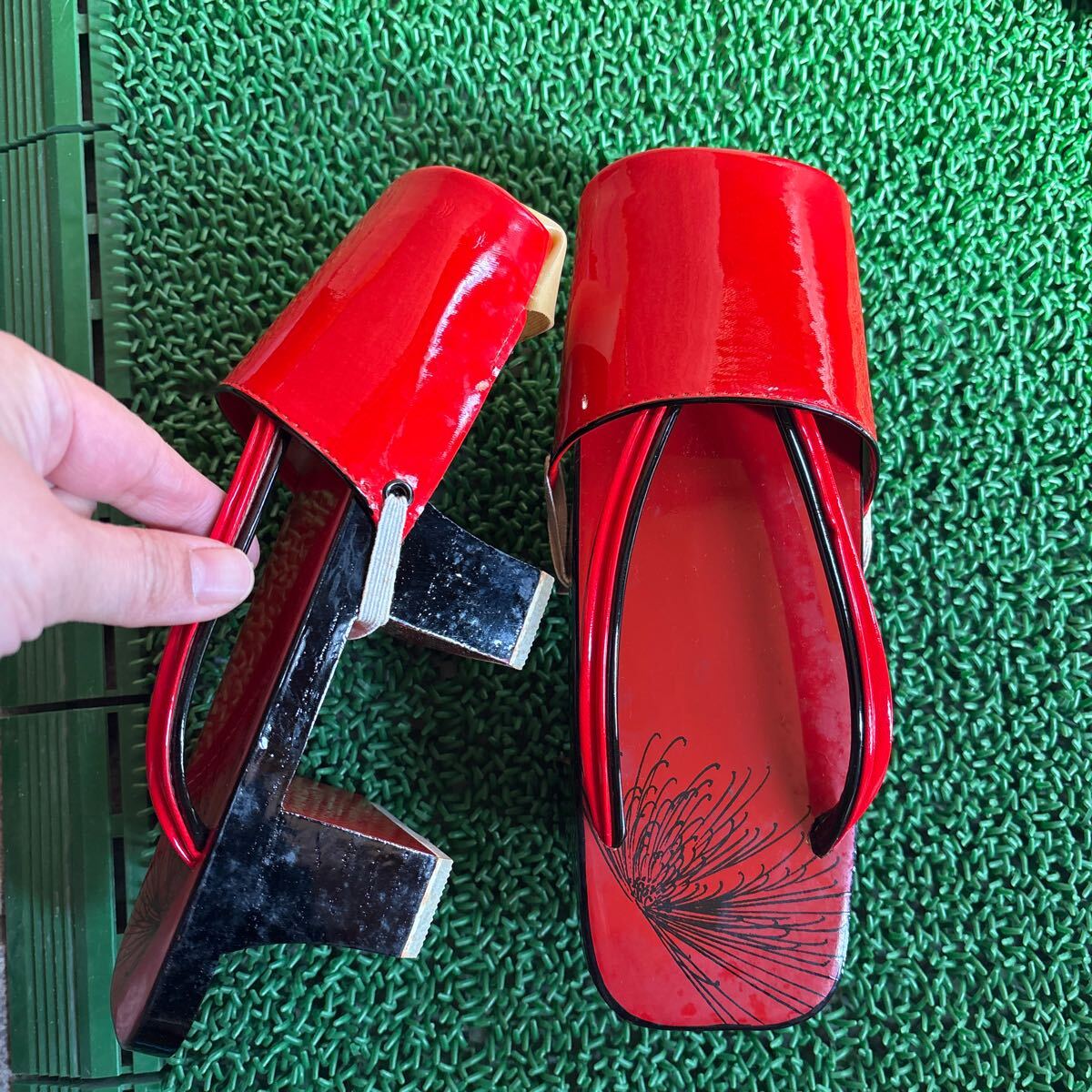 - 新品未使用雨用赤色下駄サイズ23cm M寸 レトロ柄2way