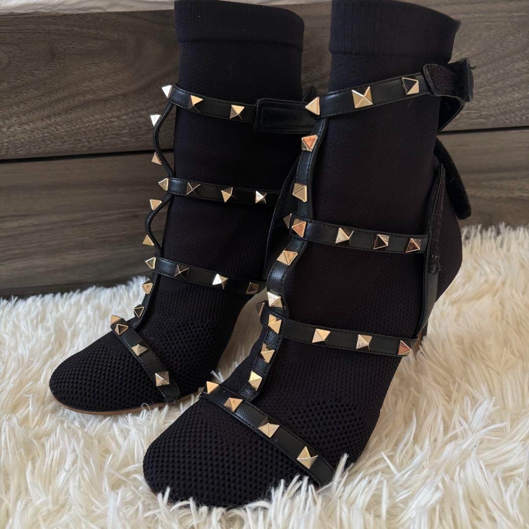 - ヴァレンティノ スタッズ レザー ファブリック オープントゥ ショートブーツ 黒