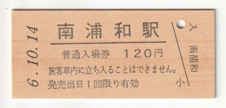 - 平成6年10月14日 東北本線・武蔵野線 南浦和駅 120円硬券普通入場券(日付印刷)